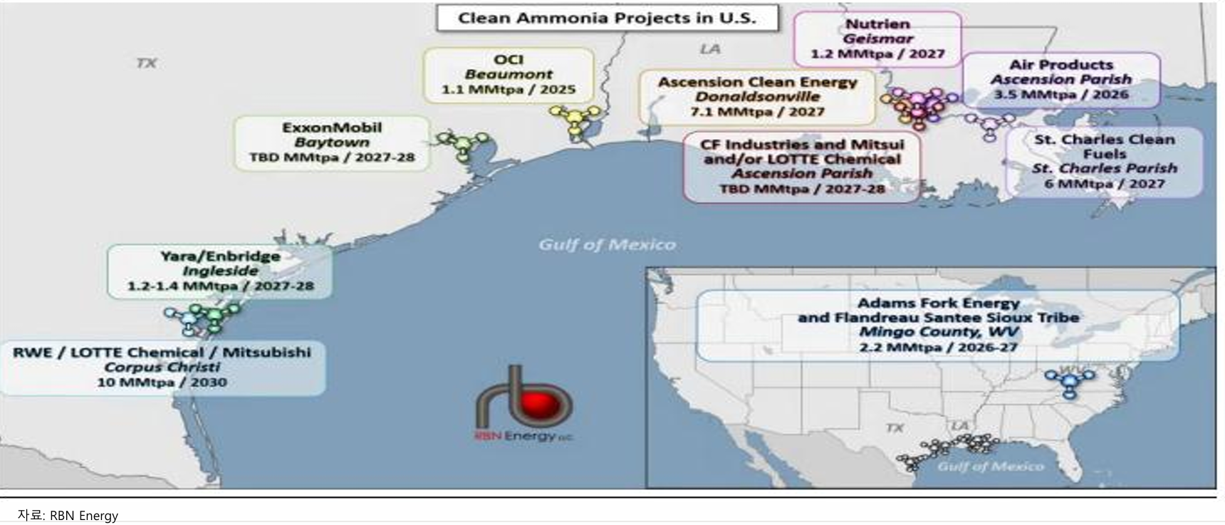 아래 그림은 미국의 암모니아 프로젝트 현황으로 2030년까지 최대 3,250만톤을 추가증설하고 있다.