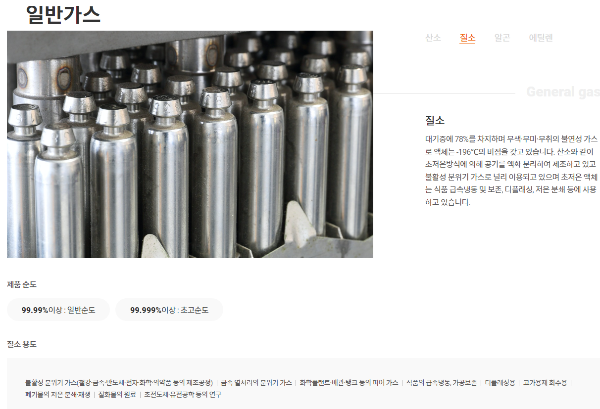 가스사업이 매출의 90%를 차지하고 가스사업 중 탄산가스류 매출이 전체 매출의 70%를 차지하고 있다. 또한 3년간 탄산가스 매출비중은 점점 커지고 있다.