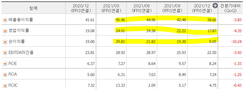 이런 장미빛 전망에도 불구하고 주가가 상향 리레이팅 되었던 2020년 말 부터 2021년 4분기까지 마진이 점점 줄어들는게 보인다. 매출이야 계절적 특성이 있다고 하더라도, 매출총이익률이 2021년 1분기에 45.46%로 피크를 찍고 하반기로 갈수록 38.66%까지 하향하는 모습이 보이고, 주가도 여름에 피크를 찍고 내려왔다.