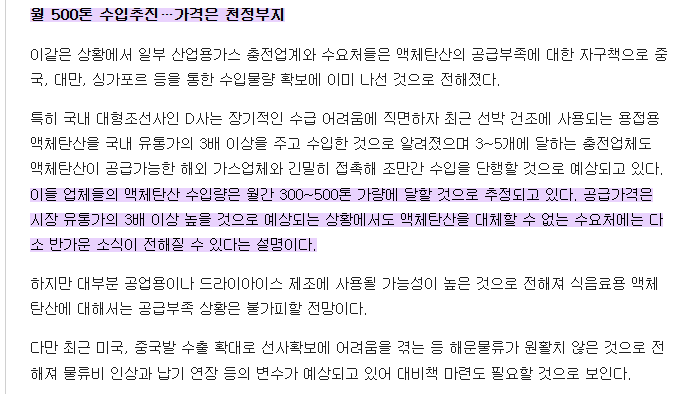 작년에도 석유화학 회사들의 가동률 저하때문에 액체탄산의 원료 공급이 쇼티지가 발생했고, 시장에서의 액체탄산 및 드라이아이스 수요를 뒷받침 할 수 없어서, 결국은 수입에 의해서 이를 해결했다.