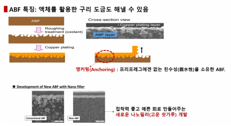 ABF는 절연체 역할도 하지만, 제일 중요한 역할은 앵커링이다. 기판을 도금액에 집어 넣고 무전해도금을 할 때 구리시드 알갱이가 도망가지 않도록 꽉 붙잡는데 이것을 앵커링이라고 부른다. 이때 접착력과 절연성을 높여주는데는 Filler라는 녹슨 쇳가루 SiO2알갱이 역할이 크다. FR-4같은 경우에는 도금액에 집어 넣으면 무전해 도금시 앵커링이 약하다.