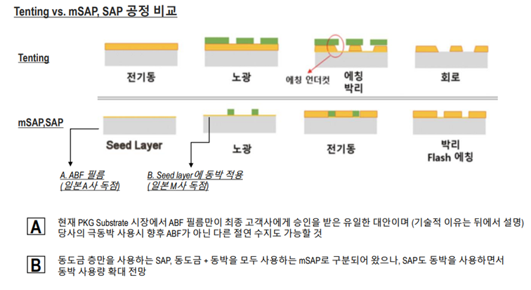 1.빌드업 소재로서 아지노모토의 ABF가 독점을 하여 의존도가 높았는데, 국내에서 생산가능한 기존의 PREPREG와도 접착력이 좋아서, 도금액 속에서 구리시드가 벗겨지지 않는 강한 앵커링을 형성한다. 즉, 빌드업 소재에 대한 선택권을 가진다는 것은 마케팅 및 마진 측면에서 상당한 유리한 점을 가지게 된다.